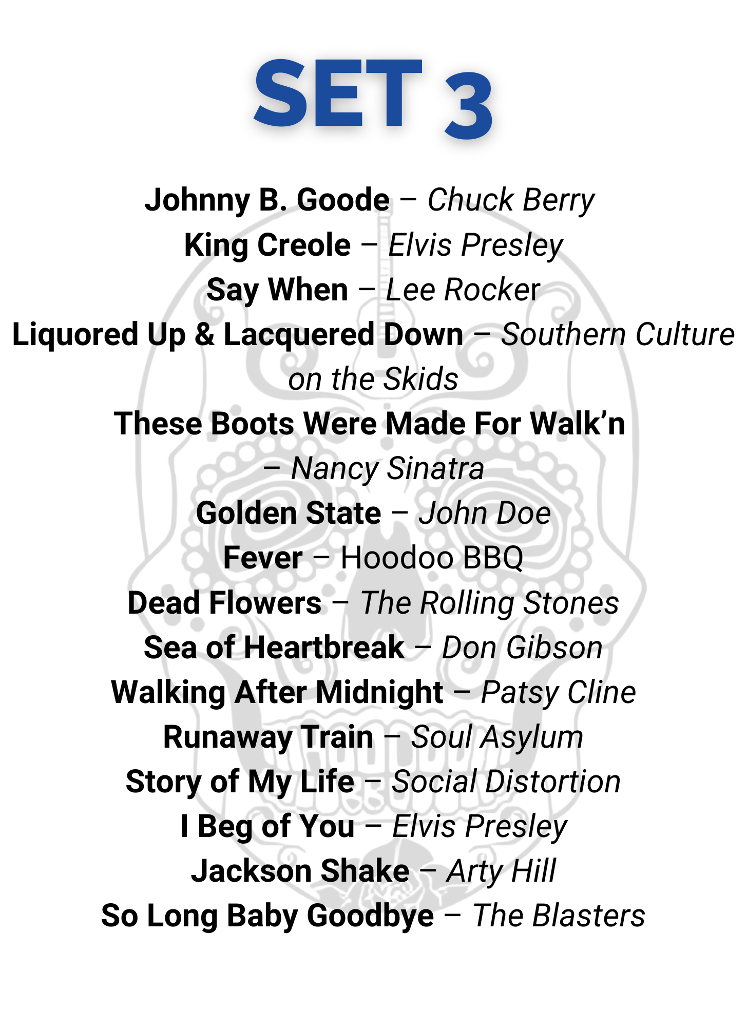 Hoodoo BBQ plays a diverse mix of music, from classic country and rock to rockabilly and blues. We also throw in some modern favorites and original songs for good measure. Here’s a sample setlist from a recent show.